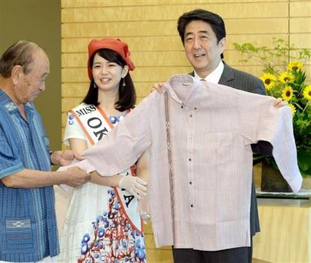 日本冲绳县知事仲井真弘多向安倍赠送了冲绳夏季传统服装“嘉利吉”。