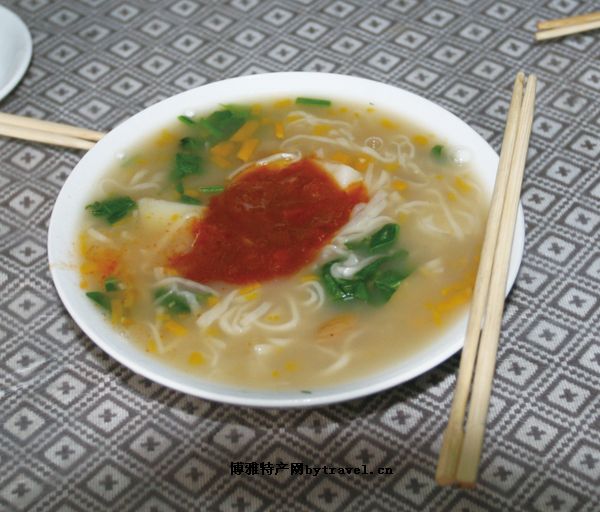 苦菜、玉谷菜)。品种可多可少,数量根据喜爱,各取所需,适量为宜。调料多用葱花、蒜片、精盐、食油、醋烹炝入锅。具体做法:锅里盛清水置旺火上烧开,先放入豆类、小米、略煮一阵,再加入易煮的蔬菜,熬熟后,投入香柱细的白面条和