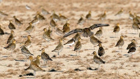 一鸟起飞,众鸟奔腾。稍有惊扰,它们瞬间跃出湿地,如同蜂群一般,几乎占满了湿地上方的天空,向六胜塔、石湖港方向飞去,那漫天飞舞的景象,令人叹为观止。在众多自然纪录片中,都会捕捉到鸟儿漫天飞舞的壮丽镜头。而当这一真实的场景出现在我们眼前时,真的不敢相信这一切是真的。从定格的画面中我们认识了它们:身穿“豹纹衫”的金斑鸻、扎着“白围巾”的环颈鸻,还有那并非黑腹(在繁殖期为黑腹)的黑腹滨鹬。