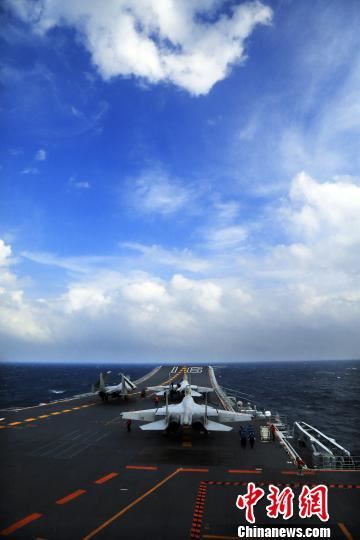 2016年12月25日清晨,东方泛白,正在东海某海域航行的辽宁舰转向东行,在导弹驱逐舰和护卫舰的护卫下,经宫古海峡赴西太平洋海域开展远海训练。南海海域,蔚蓝海天,数架歼-15舰载战斗机从14°甲板一飞冲天,与海军岸基航空兵开展了实兵对抗演练。此外,编队还及时有效处置应对了各类海空情况。
