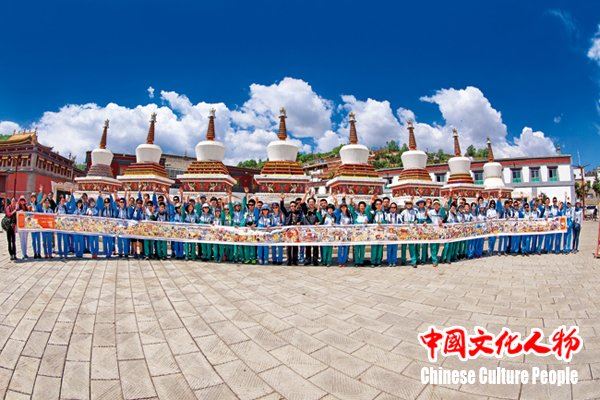 塔尔寺是中国西北地区藏传佛教的活动中心,在中国及东南亚享有盛名,国家民族画院唐卡艺术研究院执行院长、工艺美术大师桑杰本策划并组织创作的巨幅唐卡画卷在青年学子们的面前渐次展开,与身后的八宝如意塔交相辉映,美不胜收 中新社发 王保胜 摄
